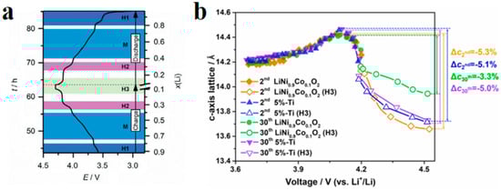 Intergranular damage occurs in secondary particles and is caused by differences in the volume change between different phases. During the process of lithium removal, the crystal structure of NCM undergoes a series of H1-M-H2-H3 phase transitions, and the phase composition is closely related to the degree of lithium removal [32]. In the NCM delithium process, the first hexagonal phase observed is labeled H1, while the second hexagonal phase is labeled H2, and so on. The observed monoclinic phase is indicated by M. Xu et al. [33] measured the phase composition of LixNiO2 and found that the phase composition is closely related to the voltage plateau and the amount of lithium removed. In detail, upon charge, pristine Li0.99Ni1.01O2 first undergoes a solid–solution reaction until ≈Li0.8Ni1.01O2, after which it exhibits a phase transformation from a hexagonal (H1 phase) to a monoclinic structure (M phase). The material maintains its monoclinic symmetry on further delithiation until ≈Li0.4Ni1.01O2. Then, it exhibits another phase transformation, namely M to H2 between x = 0.40 and 0.36 (x represents the lithium content, i.e., LixTMO2). The H2 phase remains until x = 0.26. Finally, the range of x = 0.26–0.16 is associated with the first-order H2–H3 transition at ≈4.2 V. Due to the fact that the parameters of the H2 phase on the c-axis are much smaller than those of the H3 phase, it is widely believed that intergranular cracks are caused by the H2-H3 phase transition [34]. The arrangement of primary particles is random, and the internal stress generated by the contraction and expansion of adjacent primary particles acts on the grain boundaries. During the charging and discharging cycles, intergranular cracks expand, as shown in Figure 7a. The Coulombic efficiency is usually between 70 and 95% during the first cycle of the battery. On the one hand, this is due to the formation of a passivation layer on the electrode–electrolyte surface, which consumes some active lithium. On the other hand, this is due to intergranular damage caused during the first cycle [35]. Feng et al. [36] measured the lattice change rate on the c-axis after 2 and 30 cycles of undoped LiNi0.9Co0.1O2 (UM) and LiNi0.9Co0.1O2 (PM) doped with 5% Ti, as shown in Figure 7b. After two cycles, the change rate of the PM lattice on the c-axis was −5.1%, and the change rate of UM was −5.3%. After 30 cycles, the lattice change rate of the PM on the c-axis changed from −5.1% to −5.0%, and the lattice change rate of the UM on the c-axis changed from −5.3% to −3.3%. The lattice change rate on the c-axis significantly decreased during 2–30 cycles, indicating that the strain caused during the first cycle decays during the following cycles and the H2-H3 phase transition has a certain degree of reversibility.