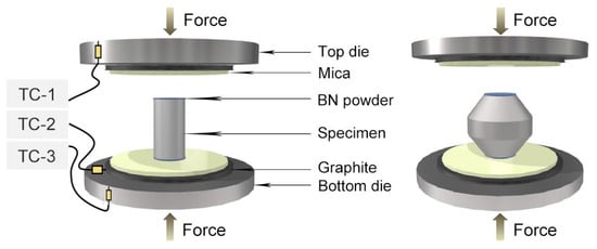 Cylindrical specimens (Φ8 × 12 mm height) and double-cone (DC) specimens (Φ20 × 16 mm height) shown in Figure 1 were used for hot compression experiments. Three layers composed of boron nitride powder, mica, and graphite foil (as shown in Figure 2) were applied on the specimen’s bottom and top ends to minimize interfacial friction between the dies and the specimen. Prior to hot compression, the furnace was heated to the test temperature, and then the specimen was loaded into the furnace until it reached the test temperature. The specimen was soaked for 15 min to obtain a uniform temperature.