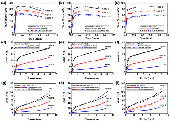 Correction of flow stress data. (a–c) True stress-true strain curves were obtained from load-stroke data after two-step correction. (d–f) Comparison of the measured load-stroke with that predicted by the corrected flow stress. (g–i) Prediction of load-stroke curves of double-cone specimens using corrected flow stress of cylindrical compression over a range of strain rate and temperature.