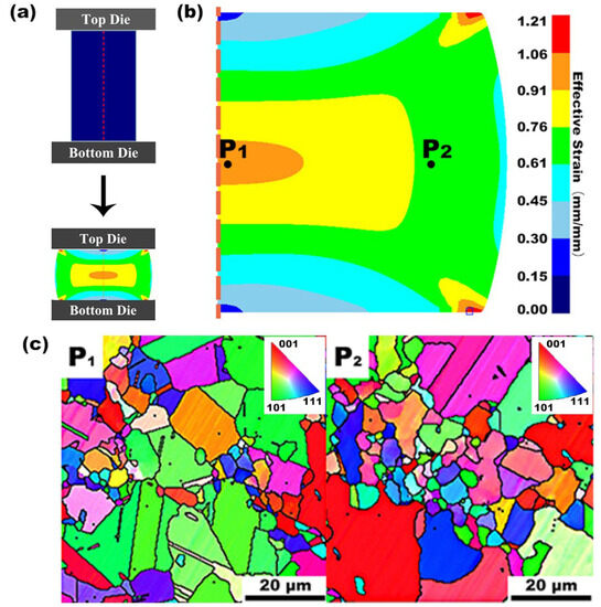 The calibration and validation of the constitutive model of the alloy and the finite-element hot deformation simulation are critical to predicting the location-specific process conditions within a laboratory specimen or a forging component. Thus, the accurate simulation of local deformation parameters is the primary aim since these are necessary to calculate microstructure information such as grain size and dynamic recrystallization (DRX) fraction [13]. Figure 4a shows geometric changes in the compression of a cylindrical specimen. The FEM results in Figure 4b show that there are strain gradients in the deformed specimen. Figure 4c shows the microstructure of the cylindrical specimen at positions P1 (hub area) and P2 (effective strain corresponds to 0.7), which are dependent on local working parameters. Based on our simulation, the strain gradient between P1 and P2 is relatively small, corresponding to a small change in grain microstructures.