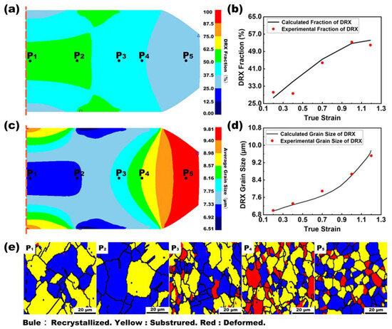 Moreover, we can compare grain size information between cylindrical and DC specimens. The grain size information from cylindrical and DC specimens was compared. P1 and P2 in Figure 4c correspond to P2 and P3 in Figure 5d. The grain morphology and grain size of cylindrical and DC specimens are similar at the same effective strain position. With the increase in effective strain at the same hot compression temperature, the grain morphology evolves from equiaxed grain to non-equiaxed grain with an irregular shape, and many fine grains appear in the middle part. The appearance of these fine grains indicates the onset of recrystallization nucleation in the specimen.