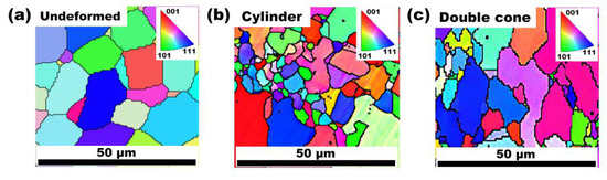 The compressed specimens were cut into two halves along the center-axis plane (along the compression direction) and prepared by mechanical grinding, polishing, and vibration polishing for electron backscatter diffraction (EBSD) observation (detector: Oxford instrument, software: AztecCrystal, data analysis software, HKL Channel 5). Under a scanning electron microscope (SEM), the acceleration voltage was 15 kV and the working current was 3 mA. Finite element modeling (FEM) was performed using DEFORM-2D software (Scientific Forming Technology Cooperation, Columbus, OH, USA).
