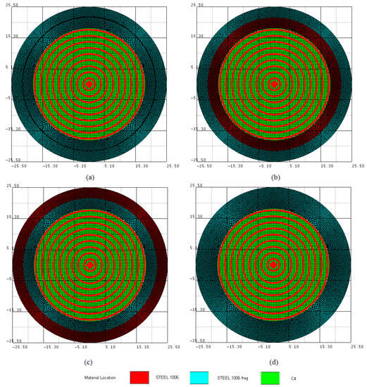 A more in-depth analysis of these aspects can be carried out based on numerical simulation, a modern tool used successfully in numerous studies dedicated to the fragmentation of bodies subjected to high loads produced by detonation or hypervelocity impacts [23,24,25,26,27]. In this study, the advantage of numerical simulation lies in the possibility to create virtual models that incorporate conditions impossible to achieve from a practical point of view. In this sense, a planar 2D model was built in AUTODYN, in three different versions. In the first version, in an Euler part of a 140 × 140 mm element filled with AIR, an explosive charge of C4 with a diameter of 37 mm was defined. The explosive was surrounded by two cylindrical and coaxial Lagrange parts, each of them with a wall thickness of 3.5 mm and loaded with STEEL 1006; see Figure 5a. These dimensions correspond to a ratio .