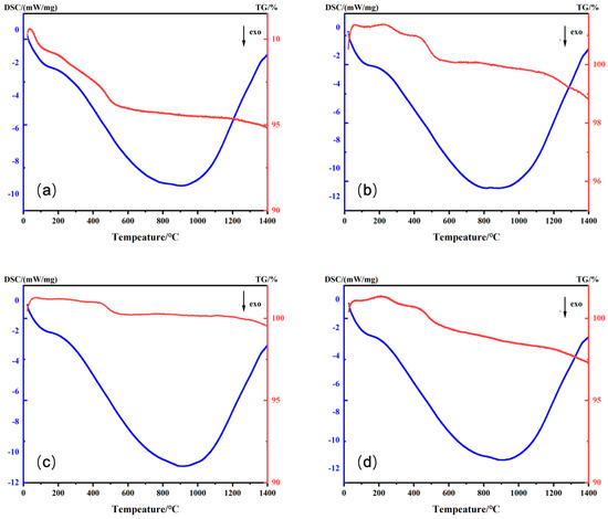 The DSC curve of the 4 samples reached a minimum at 900 °C, which indicates that they probably have advantages for use in under-glazed ceramics at high temperatures. Additionally, the exothermic peaks are also related to particle size, with a larger peak area being consistent with tiny particles [26]. There was little difference in the exothermic peak areas of the four samples in Figure 1, so the elemental ratios have no obvious influence on the size of the particle. The four samples demonstrated weight loss phenomena as the temperature rose. The residual mass ratios were all above 94.83% and reached a peak of 99.51%, which reveals their outstanding high-temperature stability and suitability for use in ceramic products.