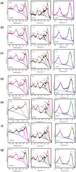 XPS spectra of Sample (a) 2, (b) 3, (c) 6, (d) 7, (e) 10, (f) 11, and (g) 13.