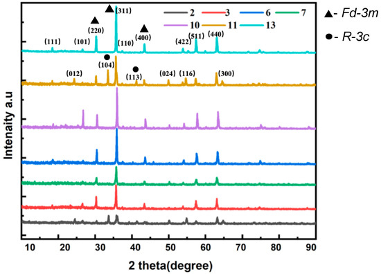 After the phases of the proposed samples were identified, it became significant to investigate their valence states because the elements involved (Cr, Fe, and Co) all have at least two valence states. Sample 2, 3, 6, 7, 10, 11, and 13 were characterized using XPS (Figure 2). The XPS results present the chemical environment of near-surface regions and relative atom ratios. In the spectra of chromium, the peaks at 576.73 and 588.37 eV correspond with Cr(III), which is also consistent with the spectra of chromium oxide (Cr2O3), as reported by Heiba et al. [27]. They also demonstrated bands of Fe(III) at 711.4 and 724.64 eV [28], similar to the results shown in Figure 2. Cobalt mainly appeared in the samples as Co(II), and the spectra were the same as those published in the literature [29,30]. The presence of a relatively narrow peak width and the inconspicuous satellite peaks on the high binding energy side of the 2p3/2 and 2p1/2 transitions suggest that only a limited fraction of Co2+ ions were situated within the octahedral positions within the crystallite lattice. To summarize, the XPS results show that Cr, Fe, and Co mainly exist with a single valence.