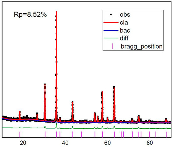 However, there are still some interesting differences among the patterns due to different ratios. For Sample 2, a solid solution, (CrxFe1–x)2O3, is an obvious phase, as indicated by the peaks (104), (110), and (300), making it distinct from others but similar to Sample 11. The lattice parameters (a) of Sample 2 and 11 (space group R-3c) relative to (104), (110), and (300) were 4.9855 Å and 4.9992 Å, respectively, which fell between the values of Cr2O3 (chromium(III) oxide, eskolaite) (a = 4.957 Å) and Fe2O3 (iron(III) oxide, hematite) (a = 5.0206 Å), as determined from the Rietveld refinement results (Table 3). The fitting profiles and R-factor of Sample 13 are shown as an example in Figure 4. The identified phase of (CrxFe1–x)2O3 and its cell parameters were both investigated by Angeles et al. [32], and our results are consistent with their results when synthesizing spinel with a composition close to MgCr2O4.