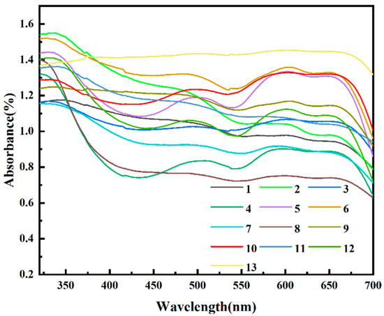 The chromatic properties of black pigments synthesized with different formulations vary from each other, owing to the differences in phases and crystal structures. UV-Vis spectroscopy (Figure 5) describes the absorption bands of Samples 1–13 in under-glazed porcelain tiles sintered at 1400 °C. All the absorbance spectra revealed similar features generally, but there were still important variations across several wavelength regions, and the absorbance values were distinguished from each other due to the varying ratios of metallic oxide used in the preparations. The color coordinate values L*, a*, and b* of the under-glazed tiles coated with Samples 1–13 are shown in Table 4, providing an alternative perspective on their chromatic properties.