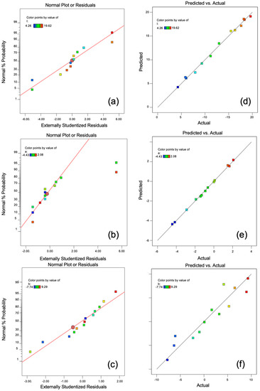Figure 6a–c shows the residual distribution of each color coordinate value, and Figure 6d–f compares the predicted data with the actual data of L*, a*, and b*. As can be seen, the values are close to the straight lines because the experimental results are in accordance with the designed model. Thus, the model system is useful to design, predict, and optimize the synthesis of black ceramic pigments.