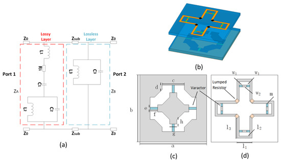 As depicted in Figure 1a, the ECM of a tunable FSR can be separated into a lossy layer and a lossless layer, with and representing the impedances of the lossy layer and lossless layer, respectively. and represent the characteristic impedance of the free and dielectric space, respectively. In this circuit, the transmission band is realized by the parallel in the lossy layer. The series can simultaneously absorb out-of-band signals. The surface impedances of Figure 1 are as follows, according to [1]: