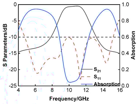 Figure 2 illustrates the reflection and transmission coefficients as well as the absorption of the proposed tunable FSR that was based using the High-Frequency Structure Simulator (HFSS). According to the results of the simulation, the 3 transmission band of the proposed tunable FSR covered the frequency range of 9.06 to 11.98 and had a relative bandwidth of 27.76%. At 11 , an insertion loss of 0.4 was found to be the lowest possible value. In addition, the working bands with were between 4.75 and 15.22 . In other words, the proposed FSR has dual absorption bands at both 4.44–7.35 and 12.76–15.42 , and both of these bands have an AR of above 80%.