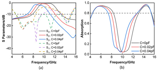 It can be seen in Figure 4a that the value of the varactors may be changed from 0 to 0.04 , which results in a simultaneous shift in the center transmission frequency from 12 to 8 . When the capacitor had a value of 0 , the insertion loss that was simulated was less than 0.5 at 11 , and the fractional bandwidth for the reflection that was less than −10 was 104.7% (4.76–15.22 ). The proposed tunable FSR had a 3 transmission band that covered the frequency range of 8.49 to 10.98 and had a relative bandwidth of 25.58% when the varactors were set to 0.02 . At 9.5 , an insertion loss of just 0.7 was achieved. In the same way, the varactors were adjusted to measure 0.04 , and the 3 transmission band of the proposed tunable FSR spanned from 7.99 to 9.92 and had a relative bandwidth of 21.55%. At a frequency of 8.5 , an insertion loss of 1.4 was measured to be the lowest possible value. Only a slight increase in reflection occurred near the passbands as the capacitance rose. This was due to the transmission frequency mismatch between the several layers caused by the simultaneous capacitance adjustment. It is crucial to keep in mind that the varactor’s series resistance increased at lower bias voltages, which accounted for the increase in the insertion loss as the varactor’s size increased. The FSR may be absorbed at a variety of capacitances of the varactor, as in Figure 4b, which shows this phenomenon. The absorption rate was 0.08 at 11 when the varactor was set to 0 , but it was over 80% from 4.44 to 8.34 and 13.09 to 15.46 . This is because the absorption rate increases with the frequency. The absorption rate was 0.06 at 9.5 when the varactor was set to 0.02 ; nevertheless, the range of 4.40 to 7.86 and 12.80 to 15.42 exhibited an absorption rate that was more than 80%. Changing the varactor value to 0.04 gave an absorbing rate of the order of 0.15 at 8.5 . In comparison, the rate of absorption above 80% ranged from 4.41 at 7.35 to 12.76 at 15.42 . It demonstrates that the passband could be tuned by adjusting the varactors, which were responsible for adding the lossy layer and the lossless layer. As the capacitance increased and moved to lower frequencies, the 3 transmission band and absorption of the tunable FSR decreased.