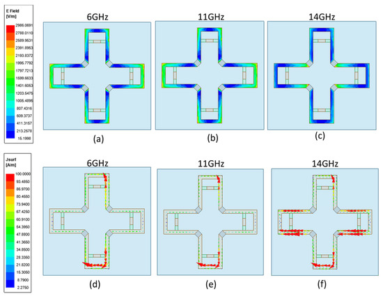 (a–c) E-field distribution under the different frequencies and (d–f) the surface current distribution under the different frequencies.