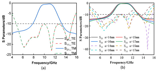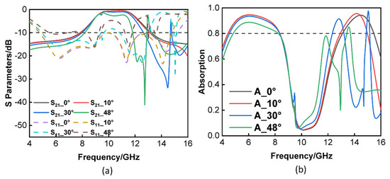 Figure 6a illustrates the reflection and transmission coefficients of the FSR under normal incidence for TE and TM polarizations. It is obvious to observe that the rates of reflection and transmission in both transverse electric and transverse magnetic polarizations were quite consistent with one another. The findings from the simulation indicated that the FSR design had dual polarization. Figure 6b verifies the effect of changing the length and width on the FSR. From the figure, it can be seen that when varying the length and width of the FSR, for the transmission wave, there was not much change. When a = 14 mm, the transmission band of the FSR ranged from 8.95 to 11.84 , whereas when a = 17 mm, the −3 transmission band of the FSR went from 9.18 to 11.71 . The only difference was that the working bandwidth of the FSR decreased slightly when a = 17 mm. The parameters were varied by 20%, and it can be seen that the device performance did not change much when the parameters were varied within a certain range. The performance of the suggested FSR when TE polarization was used was also taken into consideration and examined. When the angle was adjusted to 30°, as shown in Figure 7a, the transmission passband of the tunable FSR did not vary much; however, when the angle was changed to 48°, the transmission passband of the FSR was somewhat lowered; at this point, it was still capable of maintaining a transmission passband that was more than 1 . Figure 7b shows that the impact of altering the angle was not very significant for a low frequency, but it was somewhat more significant for a high frequency; however, it was still possible to maintain 80% of the transmission efficiency. Additionally, when using TM polarization, the transmission passband of the tunable FSR did not change when the angle was changed from 0° to 10°; however, the transmission passband did experience a slight reduction when the angle was increased to 30° or 48°. When the angle was altered while the adjustable FSR was operating with TM polarization, it was easy to observe that the working band of the tunable FSR did not change much. In a similar manner, the angle had an effect on the absorption rate at high frequency when TM polarization was used. Figure 7 demonstrates conclusively that when the varactor was adjusted to either 0 or 0.8 , the transmission characteristics remained constant across a range that extended from 0 to 48°. When the incident angle was increased to 48°, the reflection coefficients remained stable at lower frequency bands. The rate of change in the absorption rate followed the same pattern as the changing trend in the reflection coefficient. As the incident angle increased from 0° to 48°, it was obvious that the transmission window could remain stable with a low insertion loss being experienced.