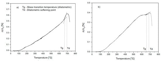 Dilatometric thermogram of glasses: (a) glass from Set 1, (b) glass from Set 4; Tg—glass transition temperature, Td—dilatometric softening point.