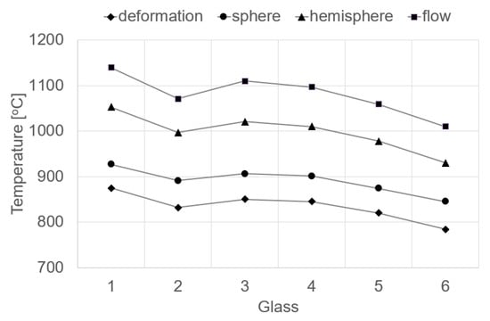 On the basis of the high-temperature analysis, characteristic temperatures were determined, accompanied by a change in the shape of the sample depending on the viscosity of the glass. This study allowed the temperatures to be determined at glass viscosity η defined in [dPa·s]: deformation of logη = 6.3, sphere of logη = 5.4, hemisphere of logη = 4.1 and flow of logη = 3.4 [33,34]. The temperatures for the characteristic (constant) viscosity values of the researched glasses are presented in Table 5 and Figure 2.