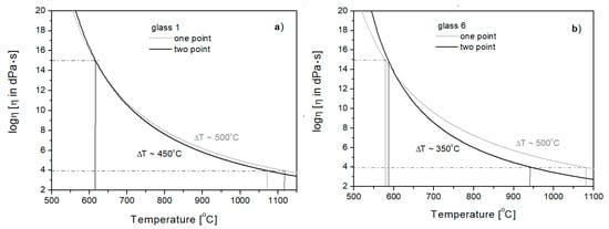 Viscosity curves of Glasses 1 (a) and 6 (b), in range of from 103 to 107 [dPa·s], determined by one- and two-point methods with fixed viscosity points.