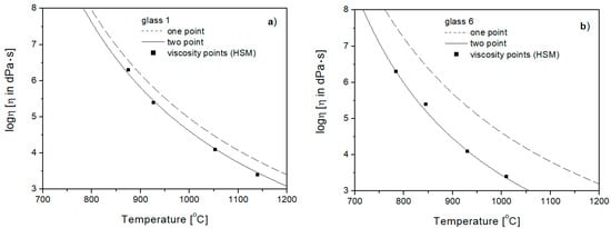 Comparing the viscosity curves in the range of from 103 to 107 [dPa·s] (Figure 7), plotted for Glasses 1 and 6 using the one- and two-point methods with fixed viscosity points determined experimentally (by hot stage microscopy—HSM), it can be seen that all the fixed viscosity points better fit into the surroundings of the curves drawn using the two-point method. This means that for aluminosilicate glasses, in order to actually present the course of viscosity changes in terms of greater liquidity of the glass mass (forming range), it is necessary to include temperature TE (η = 104 [dPa·s]) in the calculations.