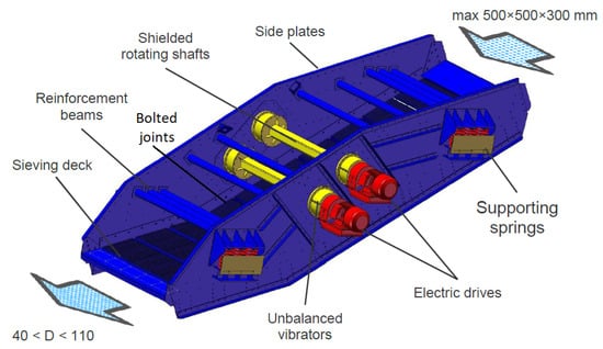 Different vibrating screens are widely used in raw material processing and aggregate industries. Vibration screens have a significant role in separating bulk materials such as the fractions of coal and ore. Sieving screens can separate from 10 to over 1000 tons per hour depending on their design, drive power, size, and the number of decks [1,2]. Cyclic excitation for screen deck motion can be produced by unbalanced rotating shafts, hydraulic cylinders, or electromagnetic actuators. Using decks and particle motion criteria, screens are classified into linear, elliptical, or circular types. Several decks can be utilized to increase general productivity and the final quality of the product.