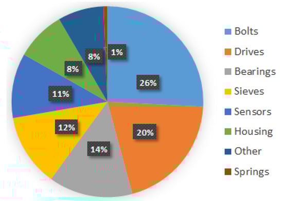 In our research, we analyze two devices. The first is an industrial vibrating sieving screen, a general view of which is depicted in Figure 1. The second machine is a fully functional sieving screen in our laboratory, a photo of which is shown in Section 5. Maintenance records and some vibration data from the industrial screen are observed for a long time to undermine its weak elements (see statistics in Figure 2). In particular, the bolted joints are determined (26% of failures), which motivated our studies on their diagnostics. In addition, the spring–mass parameters of this screen (see in Section 2.2) are used in the dynamical model simulations. The second machine was a laboratory screen, which was used to validate our method of diagnostics since we could not conduct experiments with controlled bolt loosening and measurements in the industrial plant.