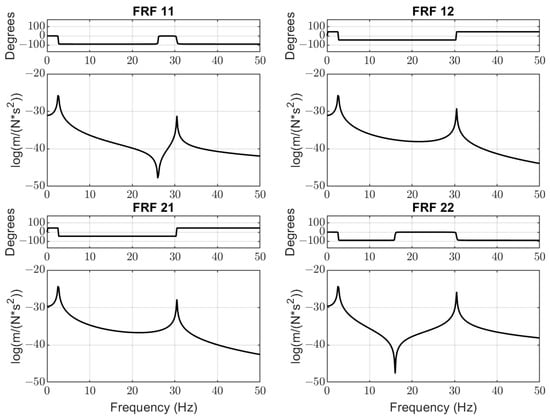 Modal testing is an experimental technique that is used to design the modal model of linear invariant vibratory systems over time. The theoretical basis of the technique is to determine the relationship between one location’s vibration response and another location’s excitation as a function of the excitation frequency. This relationship is often a complex mathematical function, called the frequency response function (FRF) [80]. FRFs are often displayed in acceleration units and force units , resulting in units. Also, there are other formats in which FRF can be displayed. These alternative formats are created by executing mathematical operations over the FRF—integration or differentiation, then, acceleration can be replaced with velocity and displacement.