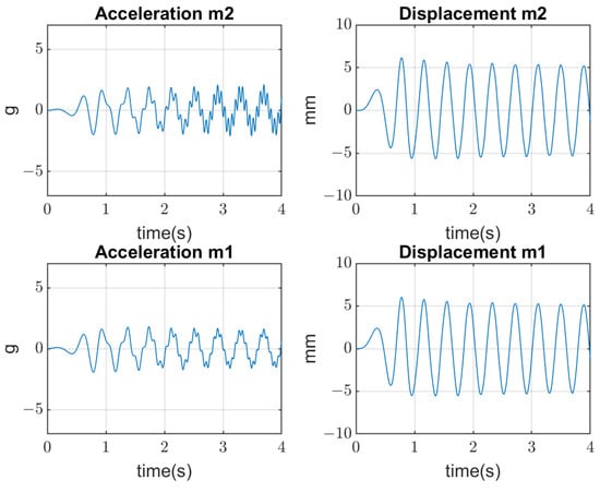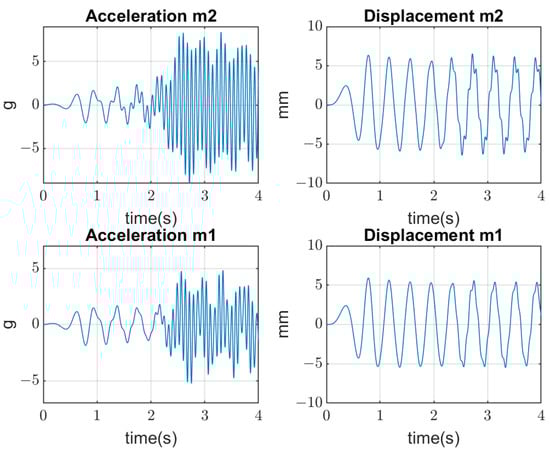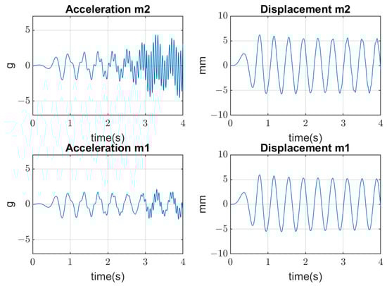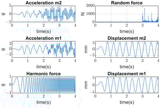 The vibrating screen simulations are conducted in several aspects. Firstly, the periodical excitation is applied to mass by the real forces acting in the industrial screen. Three cases are considered: (1) when bolts are tightened (linear stiffness ); (2) when the amplitude of vertical forces is beyond the yield stress of the bolts’ material; and (3) when the clearances appear with joints’ opening, which produces an additional impact on the bolted joints (non-linear stiffness ) and their further quick degradation until breaking. Results of simulations are represented in Figure 7, Figure 8 and Figure 9, where amplitudes of both masses in the time domain are represented. The values of mass displacement are verified by the real data of measurement (about 5–8 mm).