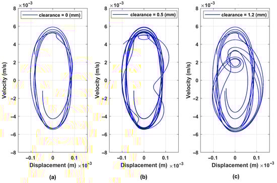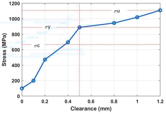 The mechanism of bolted joints loosening can be explained as developed in several steps and influenced by many factors. The initial tightening force (torque) is recommended to provide uniform clamping stress about 75% of the yield stress . During the first period after repair, bolts work within the linear range of elastic deformation, which is defined by the difference of separate masses’ displacements (). See the high-strength bolt testing diagram in Figure 11 from the work [82]. During the period of gradual deterioration, bolts are subjected to periodic forces from the vibrators, but the upper deck and the whole screen body still move in phase. At the next stage of degradation, due to additional impacts from big pieces of the treated material falling on the upper deck, the amplitude of bolts’ tensile forces reaches the yield stress of the bolts’ material, and plastic deformation appears, which creates gaps in the joints. With increasing clearances, the upper deck and screen body start to move out of phase, the ultimate stress is reached in certain bolts, and failures occur. The results of dynamical model simulations are described in Figure 12 where the tensile stress of bolts is given in relation to different clearance sizes.