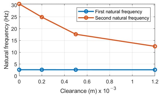 Equation (10) is a standard algebraic eigenvalue problem. The solution of it gives the eigenvalues and corresponding eigenvectors. Following the previous studies, the natural frequencies of the two lowest modes of vibrations in heavy industrial machines are rarely observed above 20–30 Hz and are sensitive to clearances in the dynamical system.