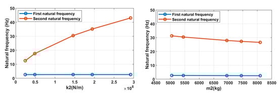 For vibrating screen analysis, the 2-DOF dynamical model is assumed, the calculation scheme for which is represented in Figure 4. The separation of the second mass corresponding to the upper deck is quite justified because its size and weight (about 5 t) are of the same order as the rest of the screen body. This is a distinctive feature of the developed dynamical model, since the screen is usually considered a single mass.