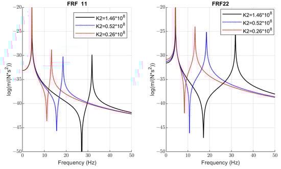 The dynamics analysis included the building of Frequency Response Functions (FRFs) of the vibrating screen. Taking into account that the total exciting force F1 from both unbalanced vibrators acts directly on mass m1 and impacts force F2 from the falling pieces of the material acting on mass m2, the following four channels are considered (see Figure 5):