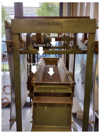 Sieving material is fed to the top of the screen by the belt conveyor with a specific linear speed. Some systems are under development [3] to prevent damage to equipment and improve process monitoring, but the conventional way is to design the upper deck of the screen as massive grizzly bars for providing scalping of the intake stream from the oversized components. The upper deck and lower levels of sieves are subjected to blinding, which induces screen overloading and technological process interruption. Also, large falling fragments of material generate force impacts with significant amplitude; thus, those disturbances which are stochastic by nature should be considered to prevent false alarms in fault diagnostic procedures [4,5,6,7,8]. The impulsive noise cancellation method for copper ore crusher vibration signal enhancement is proposed in [9]. The selection of the informative frequency band in a bearing fault diagnosis in the presence of non-Gaussian noise with a comparison of recently developed methods is fulfilled in [10]. Battery-powered wireless sensors are designed in [11] which are able to withstand vibratory loading and are embedded in the rubber screens for condition monitoring. Nevertheless, diagnostics of vibrating machines, in particular sieving screens, still is a challenge in theory and practice.