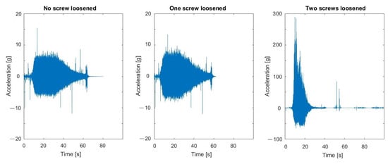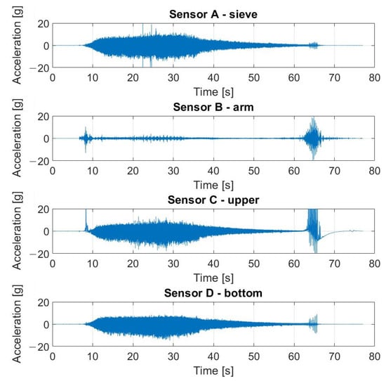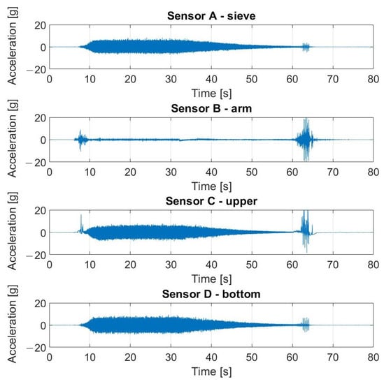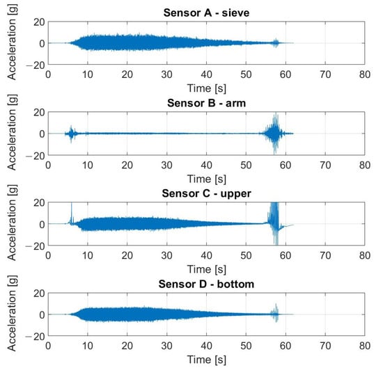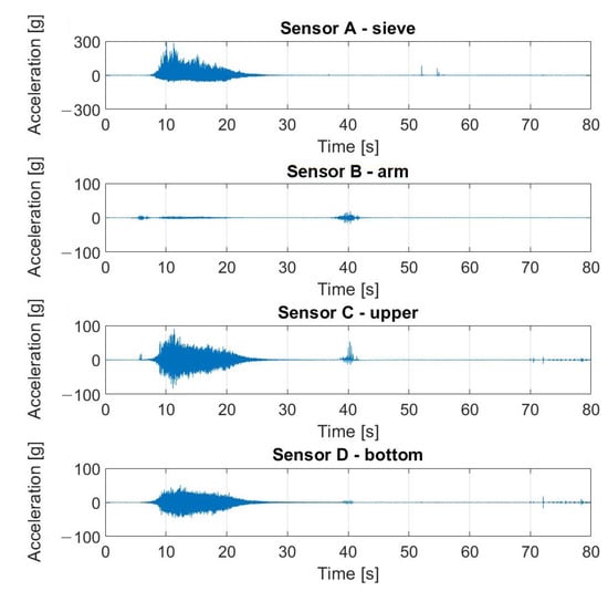 Vibration measurements were obtained by the Kistler LabAmp 5165A, a 4-channel universal laboratory charge amplifier used for dynamic signal or mechanical quantity measurements with piezoelectric sensors (IEPE) [78]. The K-Shear 8702B500 accelerometers coupled with the amplifier were used. The parameters of the sensors were as follows: sensitivity—10 mV/g; maximum acceleration range—500 g.