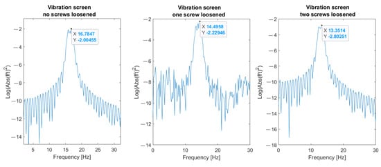 While the first mode of vibration is mainly determined by the design parameters of the screen (total mass and stiffness of springs in the supporting units), the second mode of the screen’s natural vibration depends on several factors. The most influencing factor is the gradually changing stiffness between mass m and mass m, which greatly depends on bolted joints’ condition (tightening and axial plastic deformations). The mass of sieved material on the screen decks has less influence on the second vibration mode. It was noted by the data obtained from the permanent vibration monitoring system that the spectrum of excitation force measured on the bearings of the vibrators’ shafts contains higher harmonics (30 Hz, 45 Hz) at certain periods of screen operation. This feature corresponds to the bad condition of one or several bearings or supporting springs (see Figure 6).