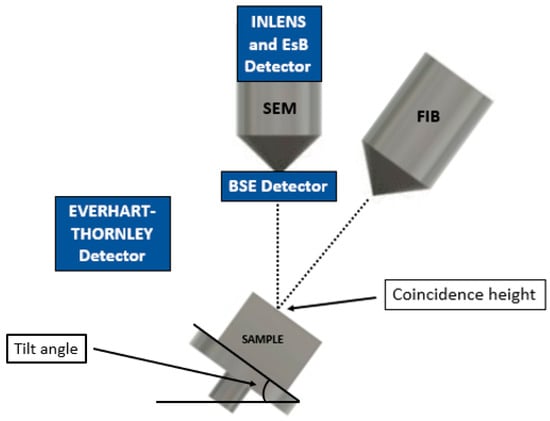 Schematic configuration of sample, columns, and detectors inside the dual beam FIB-SEM system, with the specimen region of interest (ROI) at the coincidence height, where both the electron and ion beam converge at the same position on the sample surface and at a specific tilt angle. The position of the different detectors inside the instrument is also shown, with the Everhart–Thornley and BSE detectors positioned laterally in the sample chamber and just above the end of the electron column, respectively.