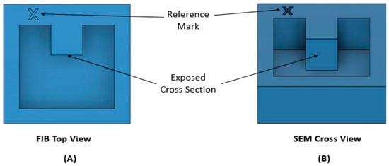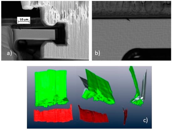 The following step is the exposure of the cross-section in front of the region of interest by using an ionic current higher than 2 nA. As shown in Figure 3, two lateral trenches are also pre-cut to avoid shadowing effects from the side walls of the cross-section and material redeposition [14,18]. A reference mark for slice alignment can then be created by milling or IBID just outside the analyzed area by the focused ion beam. Although the FIB software control generally allows the slice-to-slice distance to be selected, the actual thickness may be different from the desired value, affecting the final reconstruction. FIB tomography is a time-consuming technique and drift of the beam stage and sample may occur during serial sectioning. Zekri et al. [19] adopted a method to check the actual thickness of each slice: a triangular shape is milled over the Pt protective layer by the FIB, and, using a simple formula, it helps in aligning the image sequence and checking the actual slice-to-slice distance. Liu also suggests the possibility of performing tomography assisted by the positioning of a conductive nanoprobe close to the ROI, reducing the excess of electrons near the region of interest and improving the quality of the final reconstruction [20].