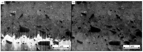 FIB cross-section of an aluminum matrix filled with SiC particles; (a) shows the original image, in which the curtain effect is evident, while (b) is the FFT-filtered image [38].
