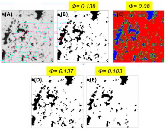 Different types of segmentation for the calculation of the porosity (φ) on Silurian dolomite image: original 2D greyscale image (A), Otsu (B), k-means (C), manual (D), and watershed segmentation (E) [48].