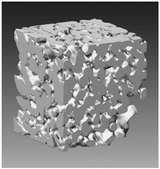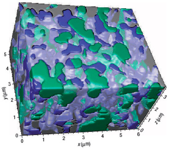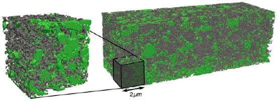 Three-dimensional reconstruction of porous BaTiO3 as conducted by Holzer et al. (cube dimensions: 1646 × 1829 × 1743 nm) [14].