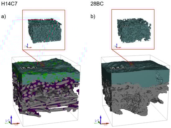 Reconstruction of two GDL microstructures, H14C7 (a) and 28BC (b), obtained by synchrotron-based X-ray tomography (pixel size: 0.325 μm, while the microporous layer (MPL) in the inlet is the FIB-SEM reconstruction (pixel size: 5 nm; 500 × 300 × 300 voxels) [70].