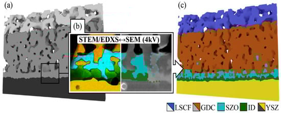 Porous ceramic films of La0.6Sr0.4Co0.2Fe0.8O3−δ, used as cathodes in SOFCs, have been extensively studied in the works of Chen [71,72] and Endler-Schuck [73], while Almar and co-authors have extended their investigations on the oxygen transport kinetics of Ba0.5Sr0.5Co0.8Fe0.2O3−δ (BSCF) cathodes [74]. Mechanisms in anodic and cathodic polarizations for screen-printed La0.6Sr0.4Co0.2Fe0.8O3−δ with a thin interlayer of gadolinium-doped ceria have been studied using a microstructure analysis of 14.9 × 14.9 × 14.9 μm3 realized with FIB-SEM tomography [75]. The same type of electrode was also characterized by Kishimoto et al. [76], who created a 1D numerical model to investigate the effect of the microstructure on the final performance, starting from a FIB-SEM tomography with 12.5 nm3 voxel size, by extrapolating parameters such as the tortuosity factor, surface area, and distribution of the pores and particles. Rhazaoui et al. applied FIB-SEM tomography as a geometrical input into the ResNet model, which was used to calculate the effective electronic and ionic conductivities of a Ni/10ScZ anode [77,78]. In this method, the 3D microstructure is represented in voxels and a potential difference is applied to this network, where, by Kirchhoff’s law of current conservation, it is possible to extract the equivalent resistance and conductivity of the whole structure. In the work of Yan et al. [79], the structure of La0.6Sr0.4Co0.2Fe0.8O3−δ powders is reconstructed by FIB-SEM tomography and used as a starting model for a discrete element approach aimed at predicting the effects of the sintering process. A correlative tomography technique for this class of materials has been developed by Wankmüller and co-workers [80] to visualize the spatial organization of primary and secondary phases at the interface of La0.6Sr0.4Co0.2Fe0.8O3−δ/10 mol% gadolinia-doped ceria/8% mol% yttria-stabilized zirconia electrolyte. This method correlates the typical 3D FIB-SEM reconstruction with the elemental distribution of the interface obtained by EDX spectroscopy in a transmission electron microscope operated in scanning mode (STEM) (Figure 8).