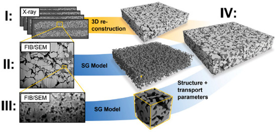 The complete workflow as proposed by Zielke [105] for the reconstruction of a LiCoO2 cathode: (I) reconstruction of the 3D distribution for the micrometric active material by X-ray tomography; (II) reconstruction of the 3D distribution of the carbon binder by FIB-SEM tomography; (III) high-resolution FIB-SEM tomography for the observation of the nanoscale features of the carbon binder. (IV) Definition of the complete model for a precise reconstruction of the entire system and an overall prediction of the electrode performance.