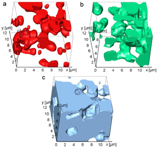 Two years later, the same authors applied this technique to samples of ordinary Portland concrete with different grain sizes in order to perform statistical shape particle analysis and a topological characterization [25]. This work also implemented the use of reference marks as part of an automated drift correction procedure. The work of Schaffer et al. [130] introduced the possibility of combining the morphological reconstruction of the FIB-SEM analysis with the elemental analysis given by the energy-dispersive X-ray spectroscopy (EDX). In this way, it was possible to distinguish not only the pore network of the sample but even the spatial distribution of the CaTiO3 and Mg2TiO4 within the ceramic matrix (Figure 12). Jiang mixed information from X-ray and FIB-SEM tomography to analyze the pore characteristics, including porosity, pore size distribution, pore shape, orientation, connectivity, and tortuosity, of cement paste made of ordinary Portland cement [131]. FIB-SEM tomography has also been used to characterize the damage corrosion of the hardmetals, such as the WC-Co cemented carbide [132]. The evolution of the cermet during the sintering process has been studied in the work of Pötschke et al. [133], while a multiscale approach for the study of the porosity of α-Fe2O3, obtained by spark plasma sintering [134], has been proposed by Papynov [135].