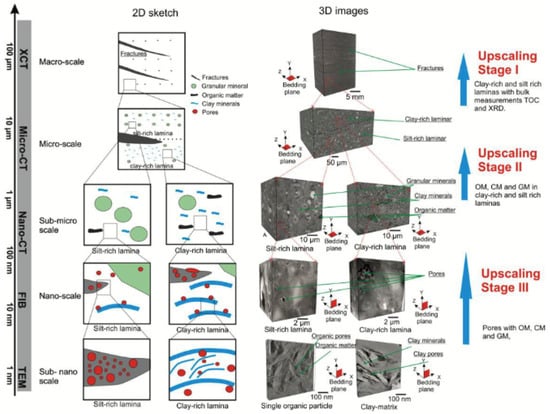 Since the work of Sondergeld in 2010 [171], where FIB-SEM tomography was performed as a technique to study the porosity of shale rock, this type of analysis has become quite common in this field of research. A precise and detailed knowledge of the real porosity of a shale rock becomes important data with which to extract information about the mechanisms that regulate the enrichment or accumulation of the gas inside the rock. Often supported by other investigation methodologies, directly (BET or mercury porosimetry) or indirectly (TEM tomography or X-ray micro-CT), the 3D FIB reconstruction has become increasingly important over the last five years, even reaching a voxel size of a few cubic nanometers. In addition, the growing interest in so-called correlative microscopy has led to the creation of workflows that bridge the gap between the nanometer scale and macroscopic observation, integrating different analysis techniques in a single result. An example can be found in the work of Ma [172], where a multiscale approach, integrating different methodologies, has been proposed (Figure 14). A list of papers dedicated to the shale rock where FIB-SEM tomography is performed is presented in Table 3.