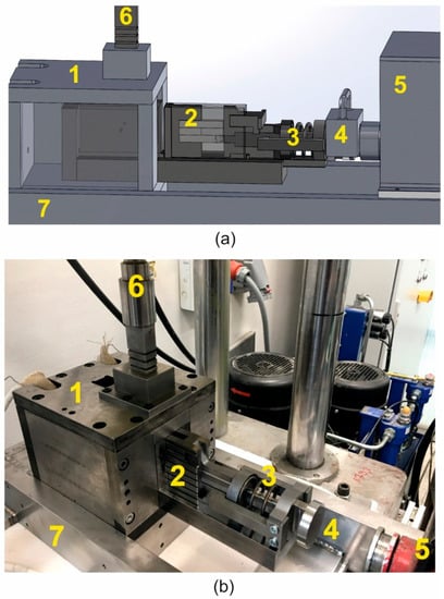 Device for weldability tests of metals and alloys: 3D model visualization (a) and research laboratory device (b); 1—heating chamber, 2—shearing and welding cartridge tool, 3—compression hydraulically driven stem with presser, 4—adapter of hydraulic cylinder and tool assembly holder, 5—hydraulic cylinder, 6—upper shearing punch, and 7—main construction ram (Patent No PL230273B1, AGH Krakow, 2018 [36]).