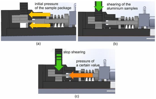 Individual stages of the weldability test: (a)—the tool cassette is inserted into the heating chamber and the presser presses the sample package, (b)—the samples are sheared with the upper punch while holding the presser continuously, and (c)—the shearing punch stops and the pressing punch applies a certain pressure to the welded samples.