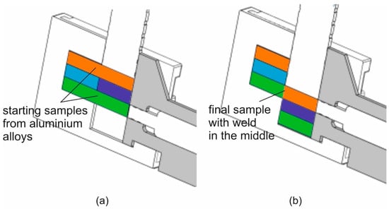 Figure 2 presents the subsequent stages of work of the device for weldability tests: a—the tool cassette is inserted into the heating chamber and the presser presses the sample packet; b—the samples are sheared with the upper punch while the presser is still held; c—after cutting, the shear punch stops and the compression punch hydraulically applies the specific pressure force on the welded samples. In this way, the situation is similar to that of the real porthole die, where separate streams of metal move on the channel surface and are welded in the welding chamber. Thus, the steel plate “plays role” of the 1 inlet channel.