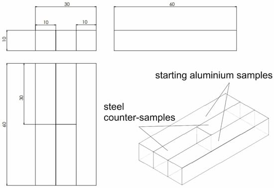 Figure 3 shows the arrangement of the samples for the alloy tested (the orange and green ones) and steel counter-samples (the blue light and blue dark ones) in the tool cassette, in the starting position (left view) and in the end position (right view). The initial sample dimensions were of 60 × 10 × 10 mm. Dimensions of samples and counter-samples in the starting position are shown in Figure 4.
