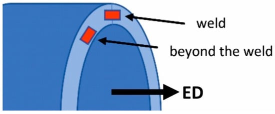 The mechanical properties of the extruded tubes were determined in the tensile test. The results indicate high mechanical properties for both the dies analyzed–higher strength properties R0.2 and Rm were obtained for the tube extruded with die 1, while slightly higher plastic properties were obtained for the tube extruded with die 2. The Rm for the unwelded material was obtained at 472 MPa (die 1) and 476 MPa (die 2). The average Rm for welded specimens is as high as 474 MPa for die 1 and 454 MPa for die 2. This indicates a very high susceptibility to welding of 7021 alloy 2 that guaranties production of high-strength longitudinal welds in the extruded tubes—the relative strength of the welds is approximately 100.5% (die 1) and 95.4% (die 2). The relative strength of the tubes is higher in comparison to that obtained in the laboratory test but it can be explained by more intensive plastic deformation in the welding chambers during the extrusion process. The slightly lower Rm values and higher A values for tubes extruded by die 2 can be explained by the local grain growth in the weld area, as well as the larger grain size compared to tubes extruded by die 1 (Figure 24).