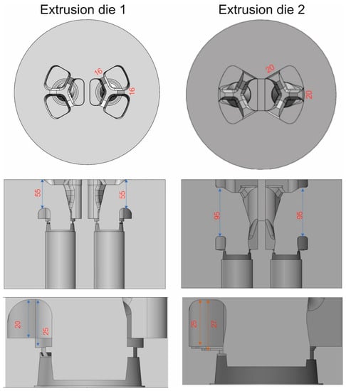 The extrusion process of tubes of Ø50 × 2 mm from aluminum 7021 alloy 2 was FEM modeled by using porthole dies of various geometries: conventional porthole die for 6xxx alloys based on the local 3-armed bridges (die 1) and die 2 with maximal broad inlet channels, shaped pockets, bearings of varied length and proper geometry of the central baffle and mandrels. Moreover, the thickness of the bridges for die 2 was increased by 4 mm, whereas their length was increased by 40 mm in relation to die 1. The dimensions of the porthole dies discussed are shown in Figure 6.