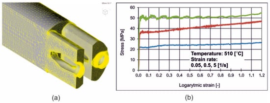 The geometry of the extruded material (a) and FEM material model indicating the dependence of plastic stress on logarithmic strain for different strain rates for alloy 2 (b); blue colour for 0.05 1/s, red colour for 0.5 1/s and green colour for 5 1/s [37].